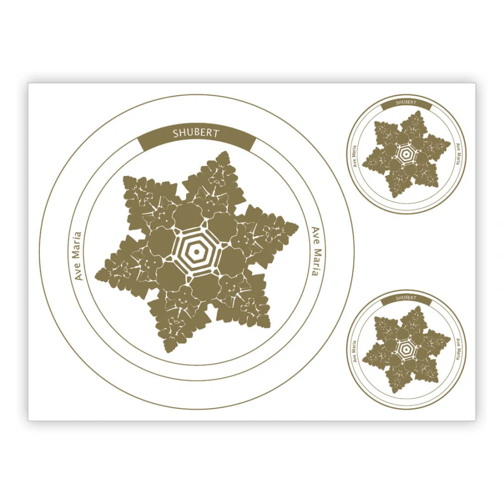 Vodní paměťová nálepka se symbolem ledového krystalu získaná po vystavení vody hudební skladbě Ave Maria od Franze Schuberta.