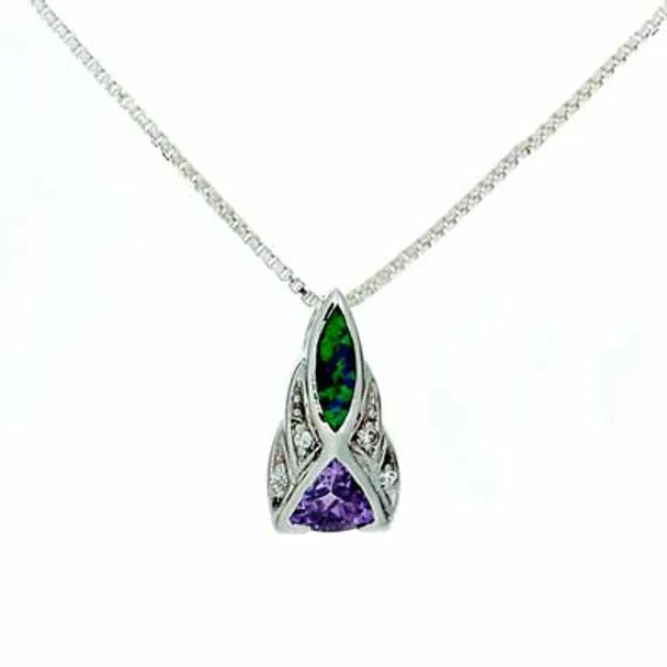 Přívěsek Tachyonized Elegance je čistě krásný, na jeho vrcholu se nachází elegantně tvarovaný opál a po stranách se kaskádovitě sbíhají akcenty kubických zirkonů, které spočívají na kameni ametystu ve tvaru pyramidy.